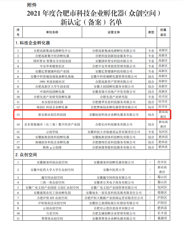 熱烈祝賀新安新站創(chuàng)芯科技園被認(rèn)定為“合肥市2021年市級(jí)科技企業(yè)孵化器”